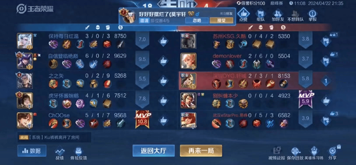 3分半易峥已经猜到了这局队友要准备投了。还不到5分钟,经济已经落后了四千多,完全就没法打了。这几位打了这么久的职业,可能也很少遇到这么逆风的局。5分半易峥说对抗路举报包成功。6分钟一到,果然就有人投降了。易峥设置的是自动拒绝,从拒绝速度来看,应该有3个人是自动拒绝的,而最后一个人点了同意。