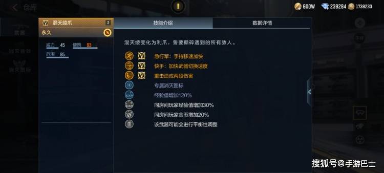 首先我们可以看到在技能方面拥有急行军和快手两个基础技能,但是混天绫爪有意思的点在于,其重击会进行一次特殊的二段攻击。即两只棱爪分别计算一次伤害,在攻击节奏方面完全一致,但是伤害会分两段,所以实战方面还是比较考验玩家的操作水平。