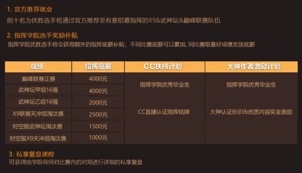 针对人才培养,官方的动作不仅体现在教学的专业程度上,还包括一系列重磅的扶持政策。在S7赛事中,官方就曾推出现金补贴奖励计划,指挥选手在赛事中获得的名次约稿,获得的现金奖励也越丰厚,对于进入巅峰联赛正赛的指挥选手,官方会给予4000元的底薪支持。