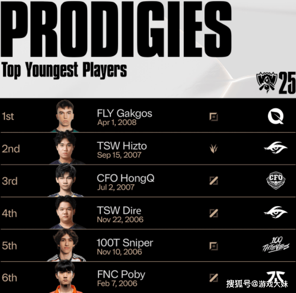 官方统计S15最年轻排名,最小的选手只有17岁,LPL无人上榜,近日,英雄联盟官方公布了 S15 全球总决赛最年轻的六位参赛选手名单,引发了玩家圈的广泛热议,这六名选手分别是:FLY.Gakgos(2008年4月1日出生)、TSW.Hizto(2007年9月15日)、CFO.HongQ(2007年7月2日)、TSW.Dire(2006年11月22日)、100T.Sniper(2006年11月10日)以及FNC.Popy(2006年2月7日)。