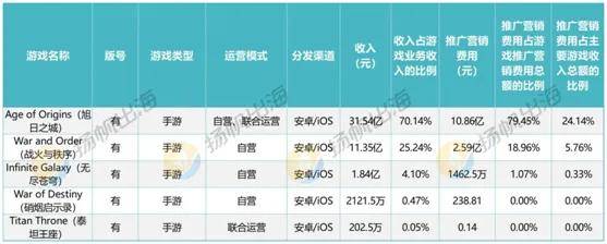 除《Age of Origins》这款产品外,神州泰岳中还提及到了《War and Order》《Infinite Galaxy(无尽苍穹)》《War of Destiny(硝烟启示录)》《Titan Throne(泰坦王座)》四款产品,其收入占游戏业务总收入比例按顺序分别为25.24%、4.10%、0.47%、0.05%。
