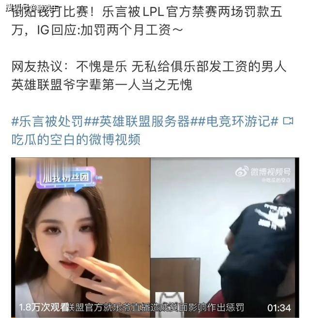 不知道是不是因为小狗过来,让它变得非常大胆,在自嗨的过程当中做出了一些不雅的动作,就连对面的巴旦木都表示,他做这样的动作不怕被平台封号吗?不出意外,在结束之后,官方直接将他的直播账号禁封了,随后,一连串的问题也是越来越多官方没有顶住压力,直接发出了处罚公告,直接对小乐言处以五万的罚款,并且禁赛两场。并且对ig战队电子竞技俱乐部也进行了两万的罚款。