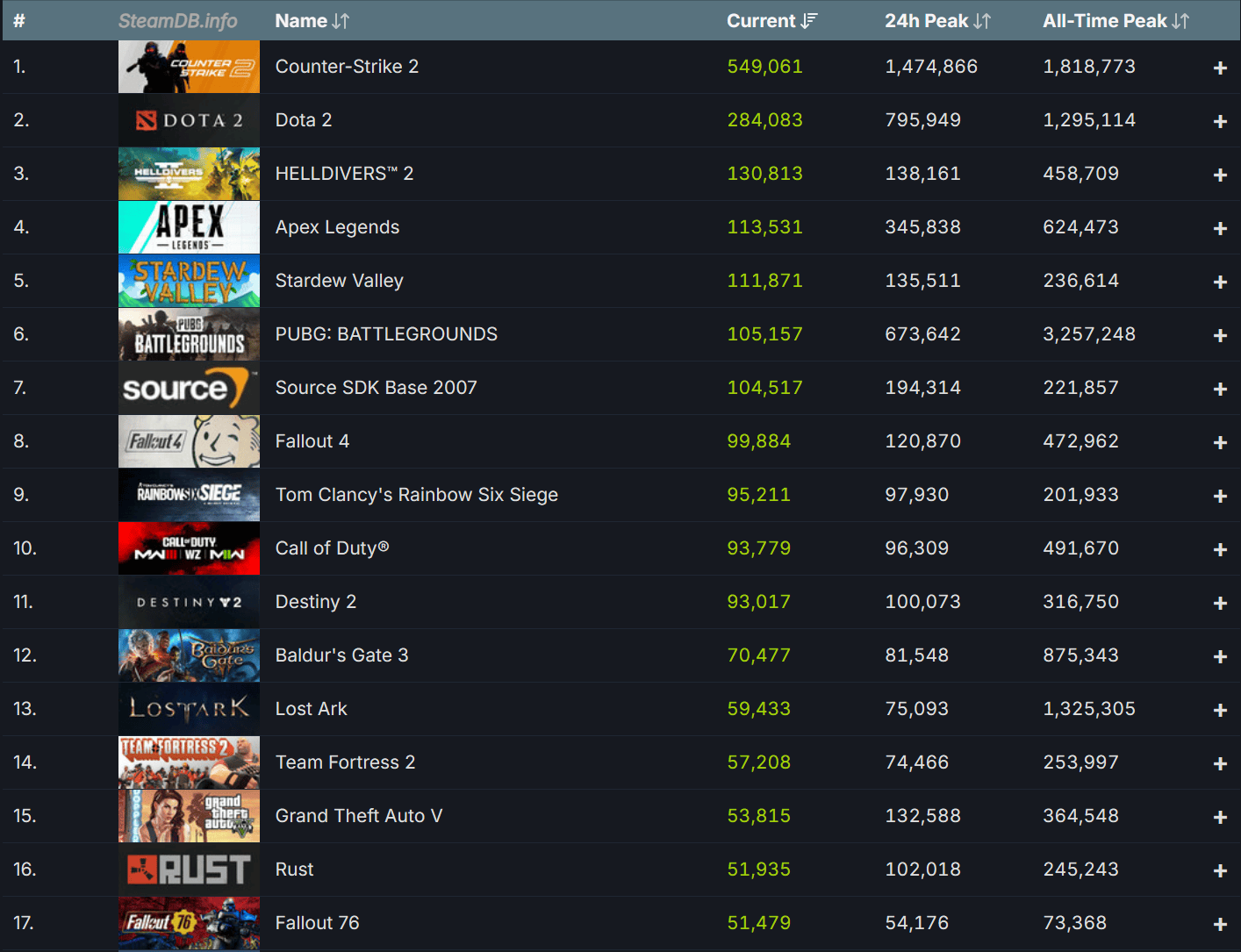 IT之家此前报道,《辐射 4》登上了上周 Steam 游戏销量排行榜的第三名。目前《辐射 76》Steam 最高在线玩家数已刷新至 73368 人。