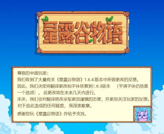 此前,《星露谷物语》发布了最新的1.6.4版本,但玩家们纷纷发现这次的新更新修改了以往的中文译文和字体,其中的新中文译文让很多玩家感到不满。在近日,《星露谷物语》开发商ConcernedApe发布声明,称其已听取了玩家们的意见,并决定要将中文译文和字体回退到1.6.3版本,更新将会在未来几天内推出,一起来看一下完整公告。