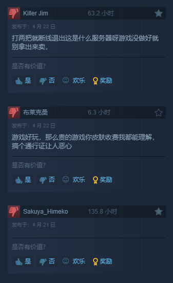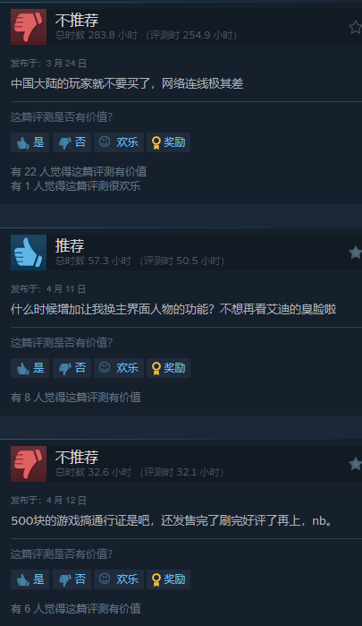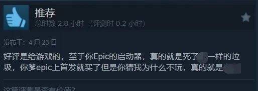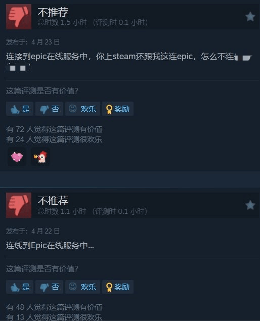 目前本作的评价仅为“褒贬不一”,有大量玩家吐槽:即使上了Steam但游玩时仍要关联Epic,并给出差评。
