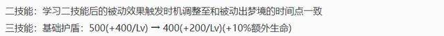主要是大招的护盾量新增了10%额外生命的加成,同时,为了保证平衡,也降低了基础和成长的数值。