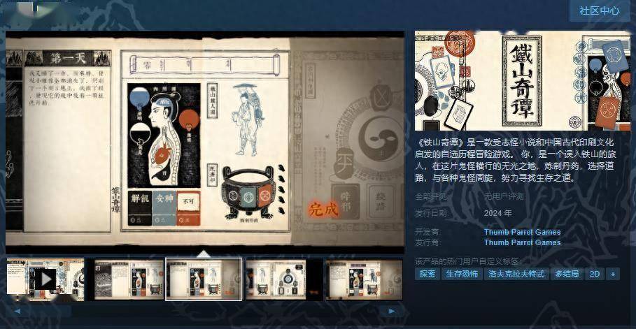 今日(4月24日),受志怪⼩说和中国古代印刷⽂化启发的自选历程冒险游戏《铁⼭奇谭》Steam页面上线,预计于2024年正式发售,感兴趣的玩家可以进入商店页面。