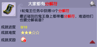 鬼王任务是常见日常任务,但有个成就是需要在1轮鬼王任务中连续拿到10张分解符。假设获取分解符的概率是10%,完成这个成就需要0.1的十次方,大概是十亿分之一几率。如果获取率为20%,也需要千万分之一的机会,想拿到这个成就必定是天选之子了。