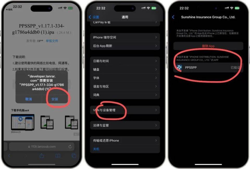 回复PSP后,点击我给你的在线安装链接,在线安装PPSSPP模拟器。当桌面出现APP图标时,点击系统设置-设备管理,信任该证书。