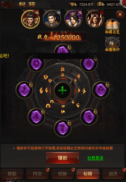 秘籍到达一定的等级是可以替换成高等级的秘籍的,每个秘籍都有不同的属性加成这里大家也是可以注意一下的。