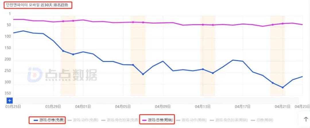 韩服首日便登顶iOS游戏免费及畅销双榜,并霸榜长达一周左右,截至目前(4月23日),该作依然位于畅销榜40名。