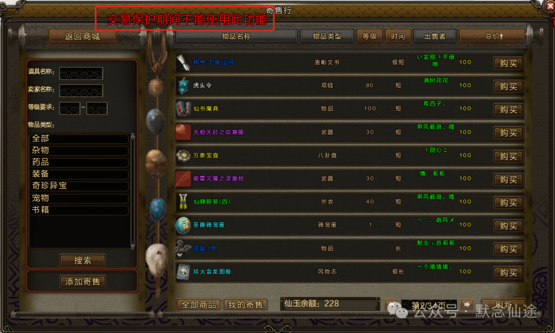 增加新建角色的交易保护期,现在新建角色在首次进入游戏后,经过6小时,才可使用寄售行的购买功能和仙玉交易功能,此功能不会影响更新前已创建并进入过游戏,并且超过6小时的角色。