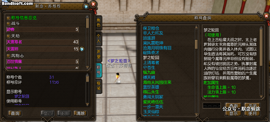 以前想换称号,只能在如下图的左边那里换,要找很久,现在可以直接在右边称号查询那里换称号了,也可以搜索到称号,快速替换,很方便。