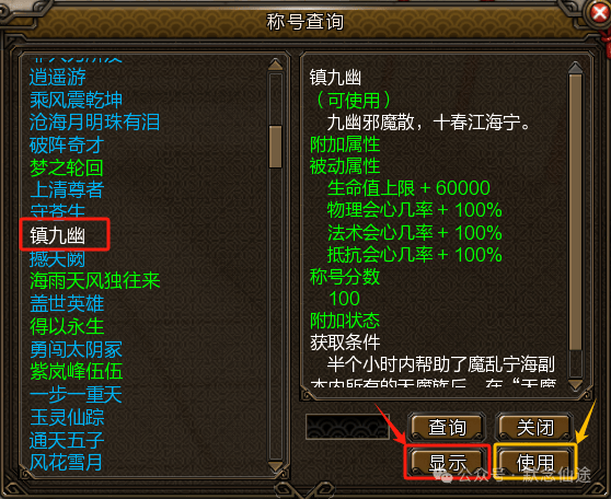 称号查询界面,查询到已拥有的称号时,可以直接点击使用或显示按钮了。