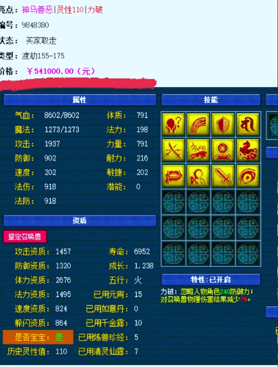 近日,丝叔的粉丝找到他,推销了一只12技能净台、善恶、神马宝宝,售价高达54.1W。虽然丝叔此前也更新了几只,但为了提升团队综合实力,决定买下它送给队友。
