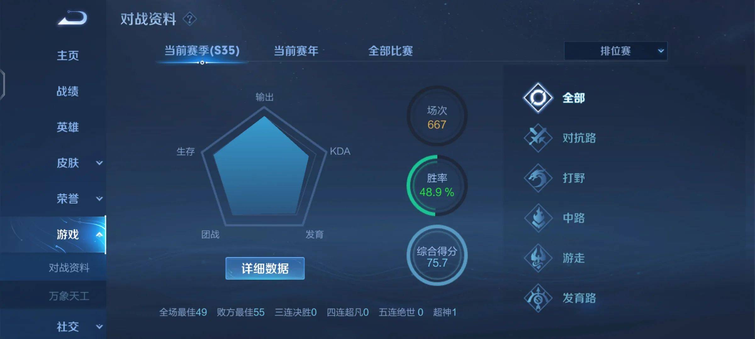 我去看了一下他的主页,在这个赛季他已经玩了667场游戏,而胜率不到49%。