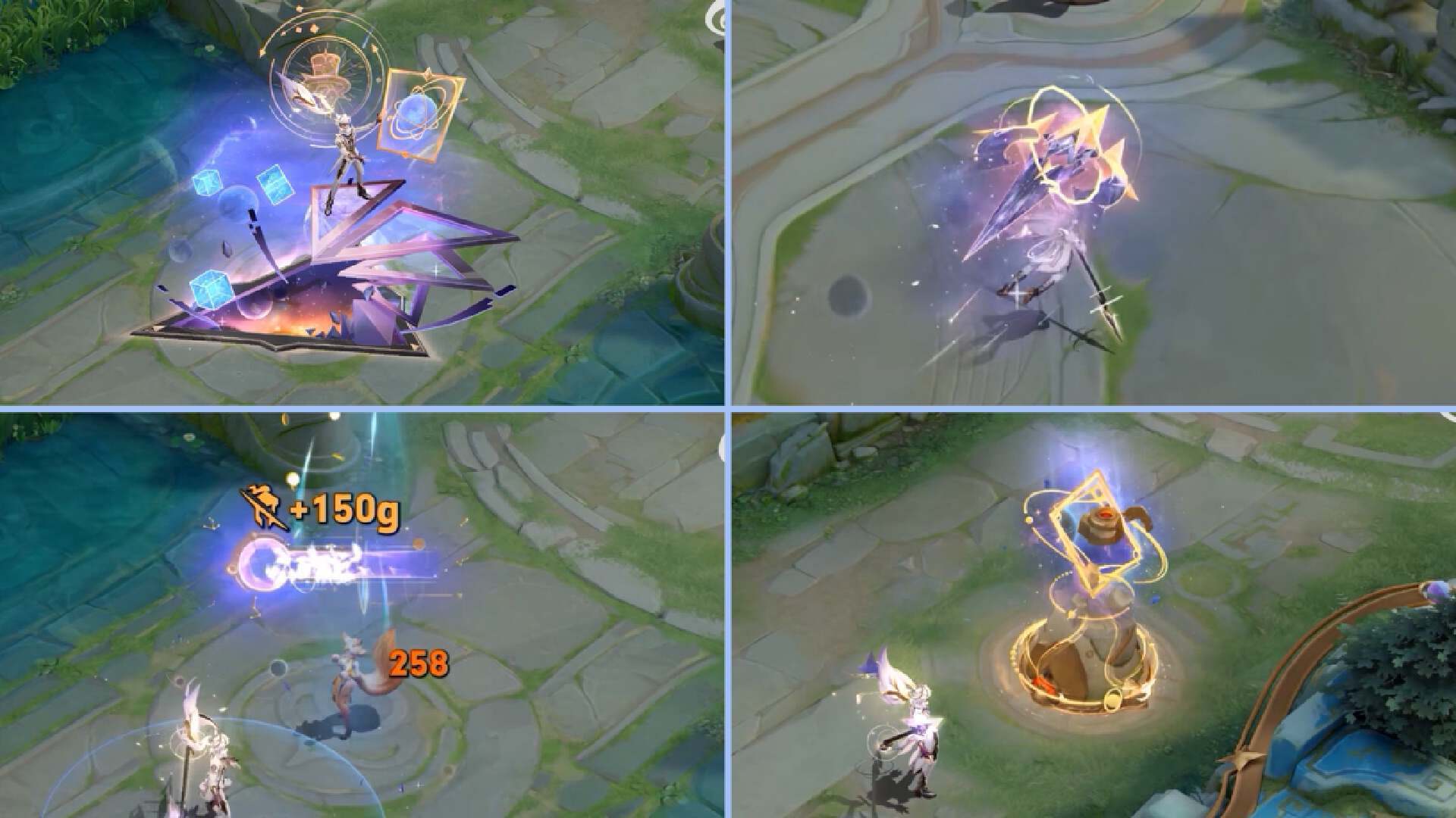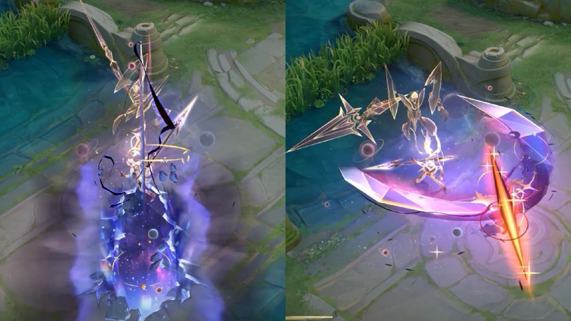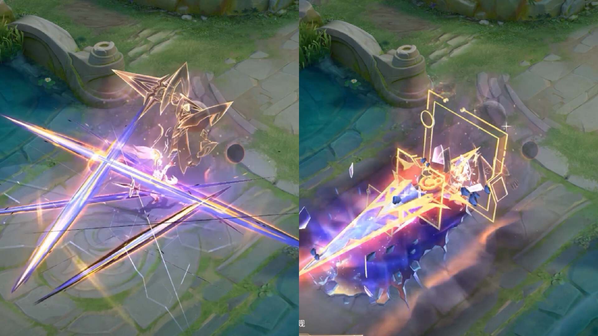 然后再来看一下技能特效,一技能的效果也是往上挑的姿势,然后地面上也会留下一个卡牌形状搭建的宇宙空间,就像是撕裂空间的感觉,第2段一技能直接穿透地表,然后地面上会撕裂空间留下星球现世。