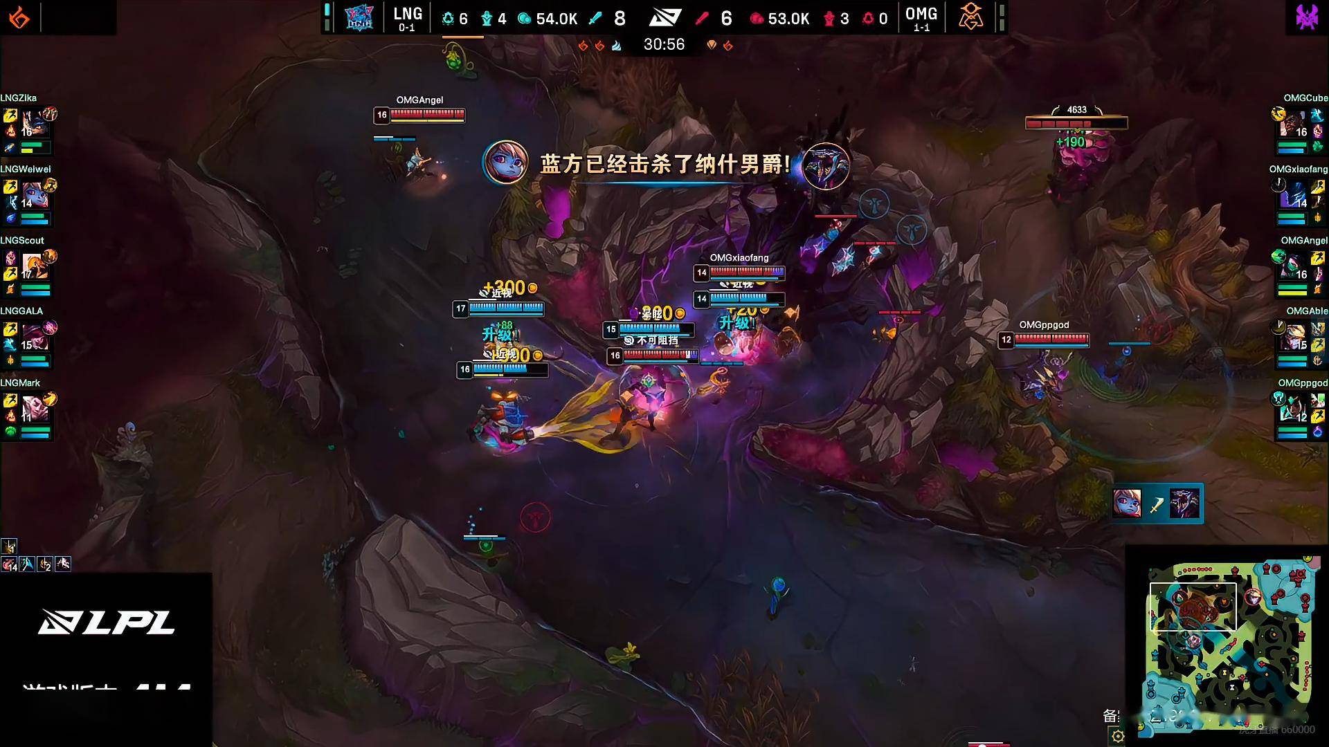 来到中期资源争夺团战,正面OMG不敌LNG,GALA与Scout的双C伤害,直接将OMG融化,LNG在中期成功控下“听牌龙”,也将经济差距进一步扩大。