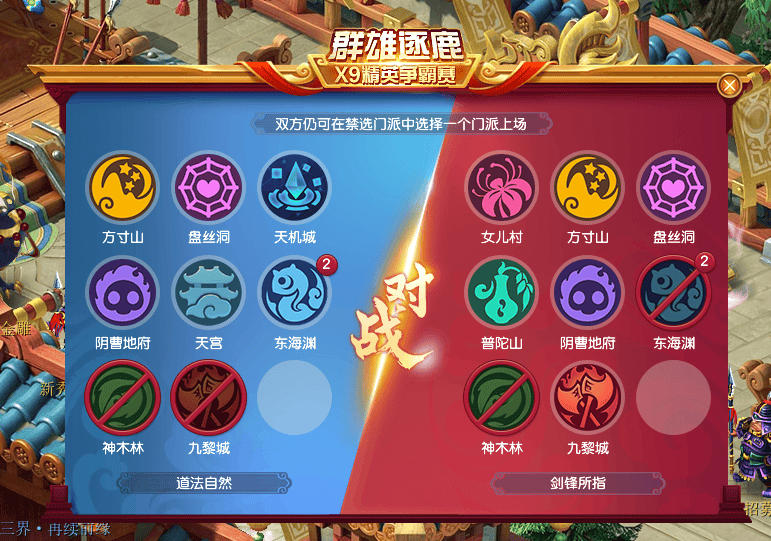 在禁选阶段,【道法自然】被禁神木林、九黎城,【剑锋所指】被禁神木林、东海渊,根据禁选规则,双方可以复活一个被禁门派。