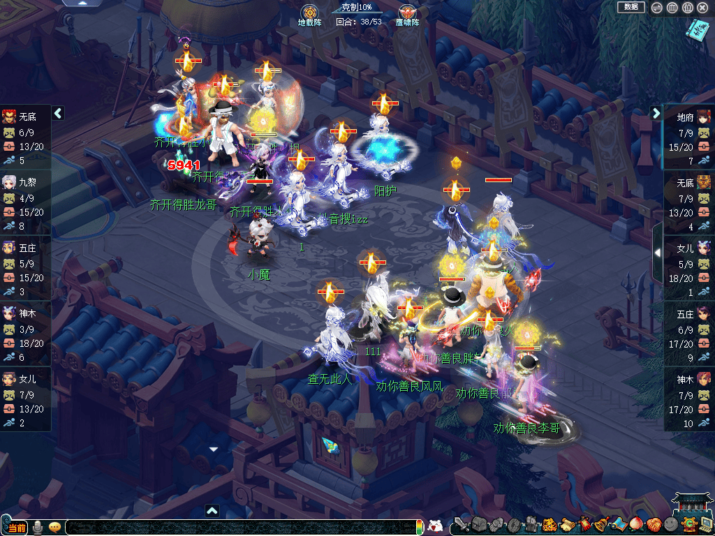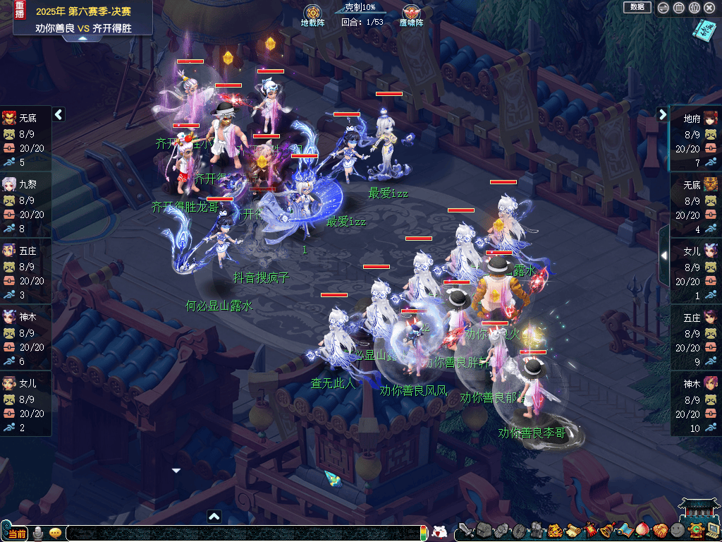 进入比赛后,【劝你善良】选用了“地府、无底、女儿、力五庄、神木”组成的“国标点杀”阵容;【齐开得胜】则采用了“无底洞、九黎、五庄、辅助神木、女儿”组成的“四保一”阵容。