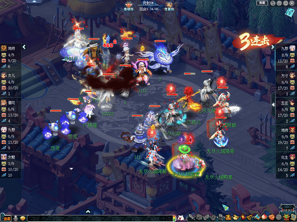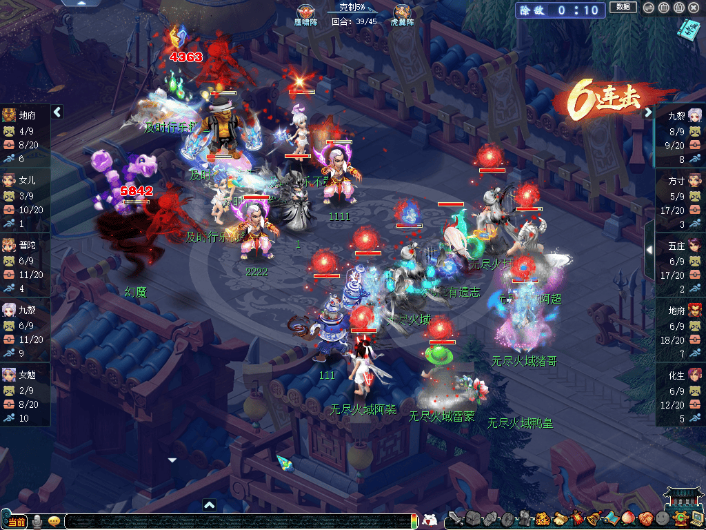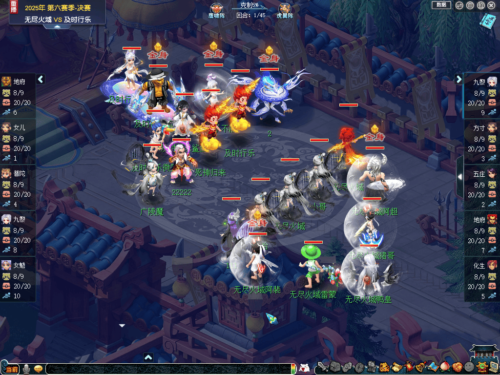 进入比赛后,【无尽火域】选用了“九黎、方寸、五庄、地府、化生”组成的“四保一”阵容,【及时行乐】选用了“地府、女儿、莲台普陀、九黎、女魃”组成的“点杀”阵容。