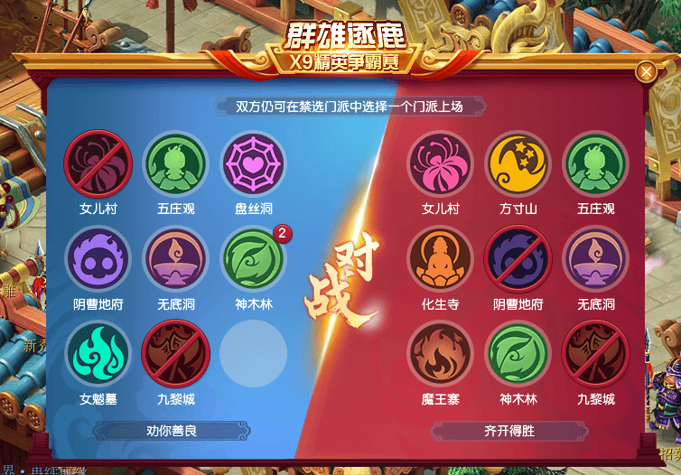 在禁选阶段,【齐开得胜】被禁地府、九黎,【劝你善良】被禁女儿村、九黎城。根据禁选规则,双方可以选择一个被禁门派复活。