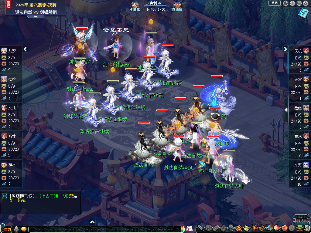进入比赛后,【道法自然】选用了“封天机、天宫、盘丝、辅助神木、东海渊”组成的“四保一”阵容;【剑锋所指】则采用了“九黎、盘丝、女儿、方寸、辅助神木”组成的“四保一”阵容。