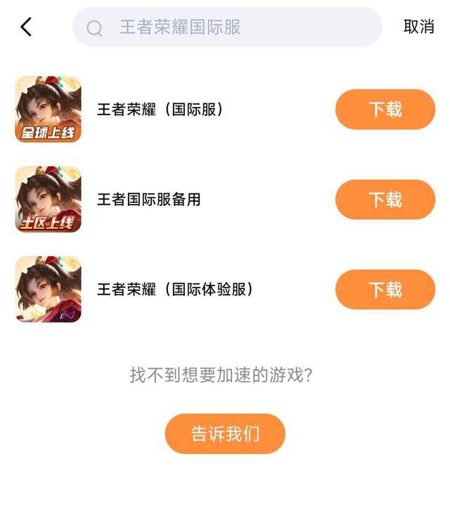 之后在小6加速器的搜索栏输入“王者荣耀国际服”,搜索结果第一个就是了。点击“下载”按钮,就可以自动获取官方正版安装包,下载并安装了。