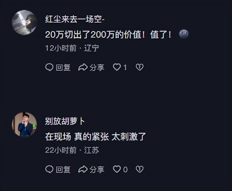 不少在场观看直播的玩家都表示这切玉佩是真的太刺激,太有观赏性了,20万的玉佩被切出了200万的价值,连情绪价值都给大佬提供的足足的,难怪会吸引这么多人切玉佩上头。