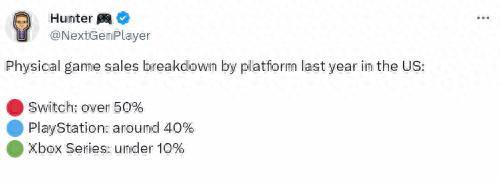 机构Circana分析师Mat Piscatella指出,2023年美国地区,任天堂平台实体游戏销量市场占比超过了50%,PS平台占比约40%,而Xbox实体销量甚至不足10%。总体而言,Xbox的受众似乎更倾向于数字版游戏,XGP也是影响实体销量的原因之一。