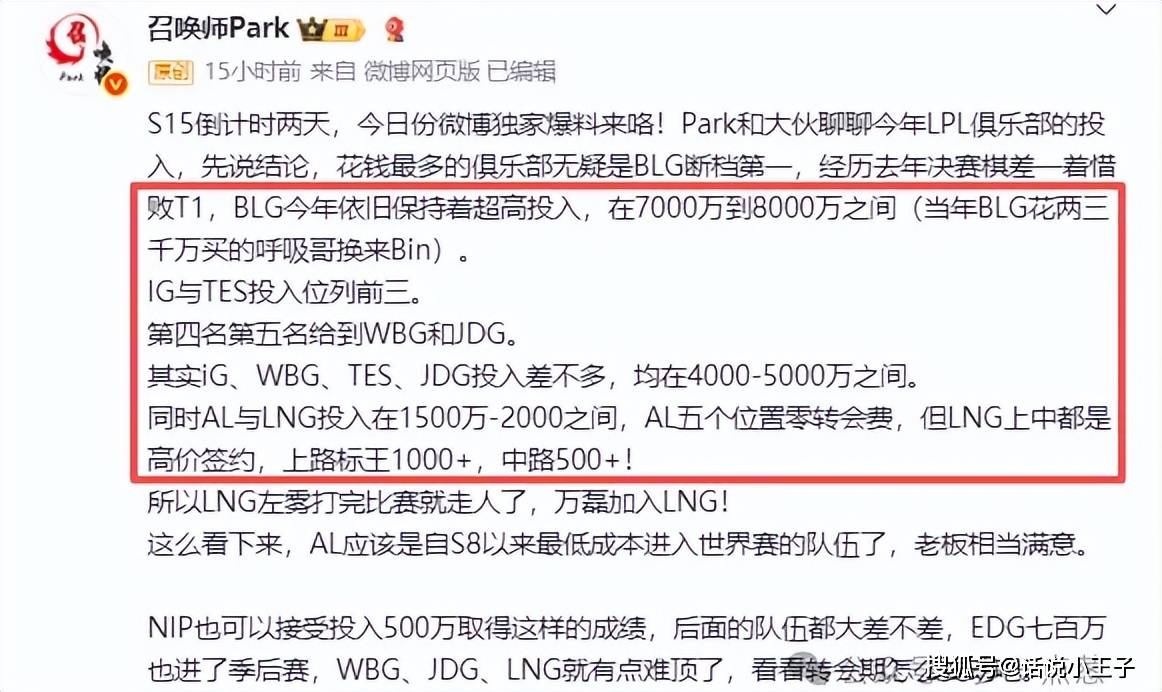 这名知情人就表示,今年LPL众多俱乐部中投入最多的钱就是BLG,而且还是断档第一,今年投入了大概是7,000万到8,000万之间。IG和TES投入花的钱应该是排名在前3,第4名和第5名应该是WBG和JDG。不过这名知情人也强调IG,TES,WBG和JDG投入的其实都差不多,大概都是4,000万到5,000万之间。