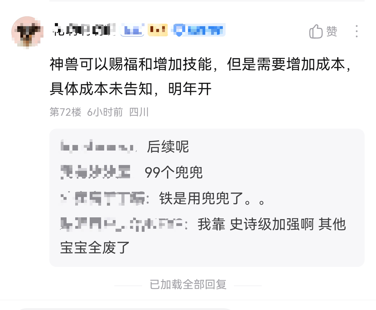 今日,有位玩家在参与成都站的见面会后,爆出“神兽可以赐福和增加技能”的消息。如果该功能实装的话,势必会引发一场任务召唤兽的变革。不过,根据之前的出现的泡泡相伴系统,即便神兽能像畅玩服一样增加技能,也会需要极高的神兜兜成本。但不管怎么说,只要加强了,就算是好事!