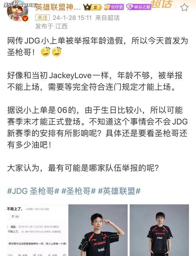 正当大家都觉得小孩儿哥会一直上场的时候,春季赛的首场比赛jd g战队却更换了自己的首发阵容,上单选手圣枪哥回归赛场。这个事情一出,迅速引发了大量玩家的热议,毕竟圣枪哥的年龄非常大了,操作肯定也不如新人稳定,Jd g战队为什么会在春季赛的时候临时换将呢?一些业内人士透露了人员调整的原因,网传和当初的阿水一样,年龄不够,被举报不能上场,需要等完全符合联盟的规定之后才能上场。确实,当年的阿水在官方的年龄调整之后,也是有过一段时间的休息。