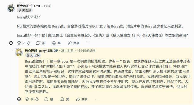有玩家询问该作的boss战表现如何时,贴主回答道:BOSS战设计得相当精彩!第一章的BOSS完全是一场操作检验。我最初屡屡受挫,因为一看到红标就慌忙激活形态,导致能量条被胡乱耗尽。反复失败十几次后,终于沉住气领悟到要策略性保留能量——虽然积攒速度不慢,但必须用在关键时机。