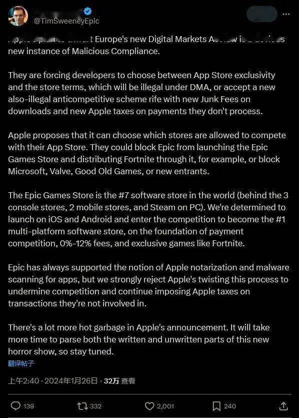 为此,Epic的首席执行官蒂姆•斯威尼(Tim Sweeney)专门在推特发布了一篇长文,将苹果新条款称为一坨“热气腾腾的垃圾”。