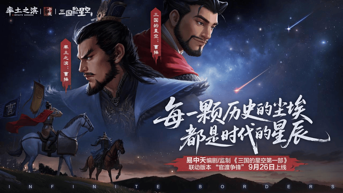 还有前几天,和《三国的星空》动画电影的联动。这部电影由易中天编剧监制,是三国题材动画大片。《率土之滨》不仅同步推出了官渡之战主题服,还让玩家能通过活动免费获得电影中的联动画像、纪念卡,甚至有机会拿到观影券。
