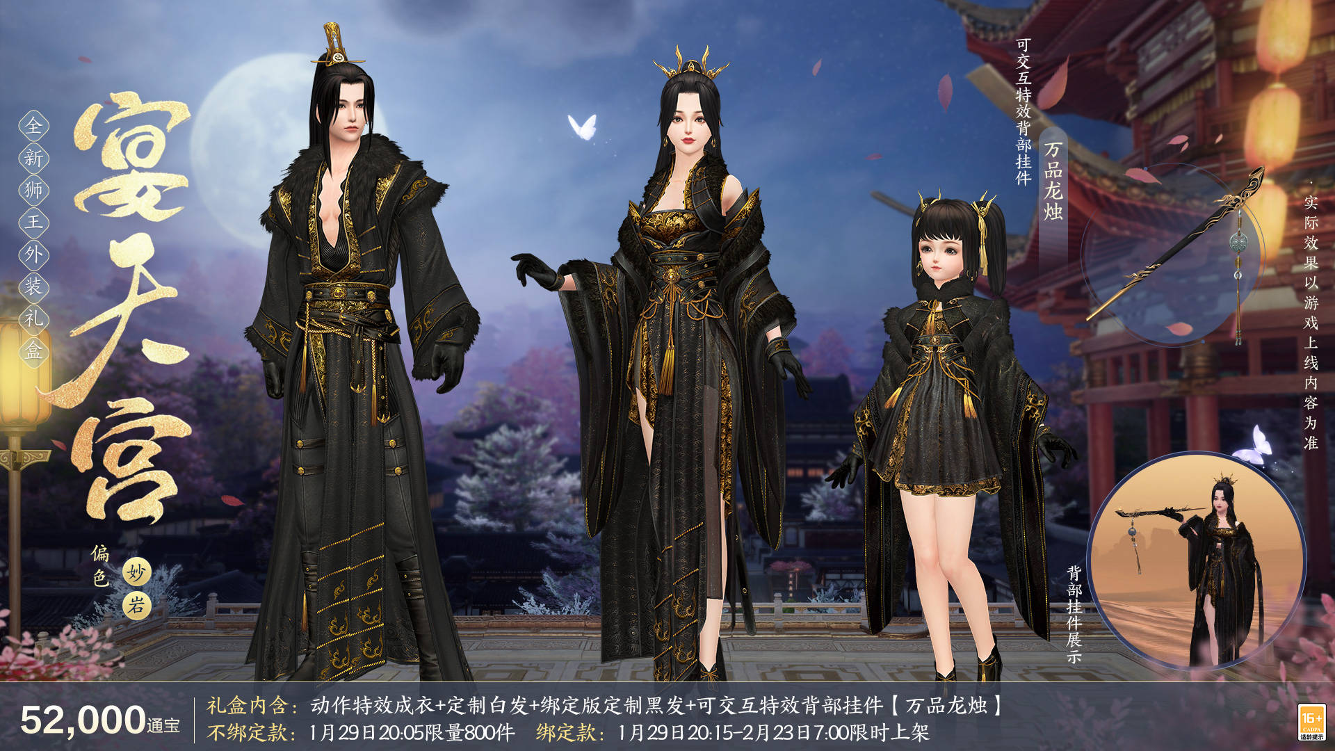 礼盒内含动作特效成衣+定制白发+绑定版定制黑发+可交互背部挂件「万品龙烛」。不绑定款将于1月29日20:05上架,限量800份;绑定款将于1月29日20:15至2月23日7:00限时上架,每款售价52,000通宝。