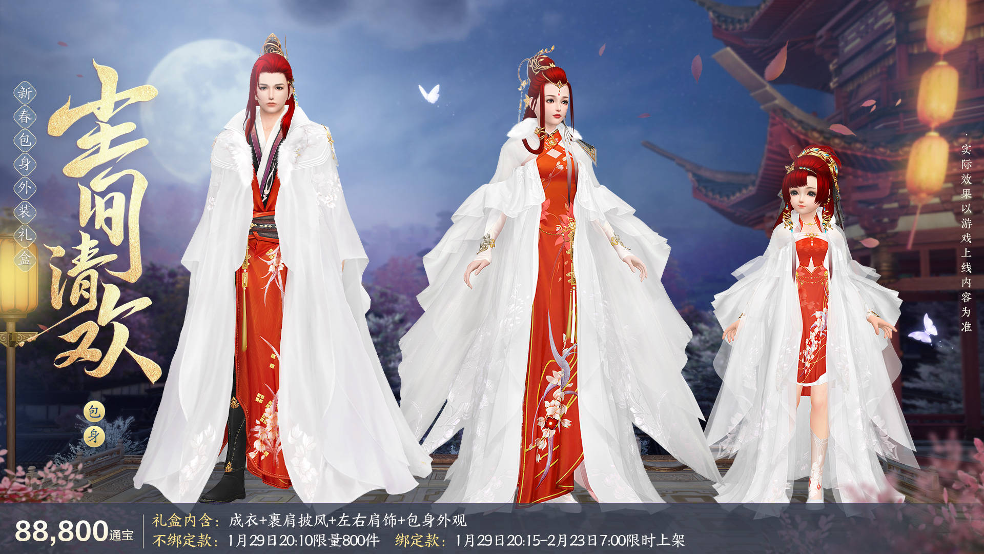 礼盒内含成衣+裹肩披风+左右肩饰+包身外观,该礼盒不绑定款将于1月29日20:10上架,限量800份;绑定款将于1月29日20:15至2月23日7:00限时上架,售价88,800通宝。