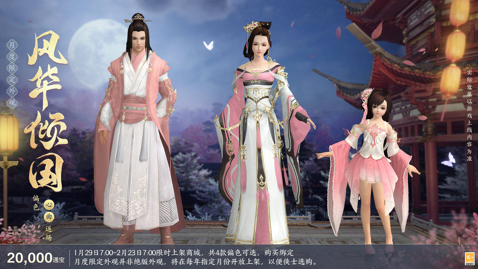 有姝倾国色,一舞尽风华。月度限定主题外装“风华倾国”华美登场。新增“时难”“谁懂”两款偏色,同时“宛月”“心曲”两款偏色返场,共四款偏色可选。该外装将于1月29日7:00至2月23日7:00限时上架商城,购买绑定,售价20,000通宝,侠士可选择心仪偏色购买。