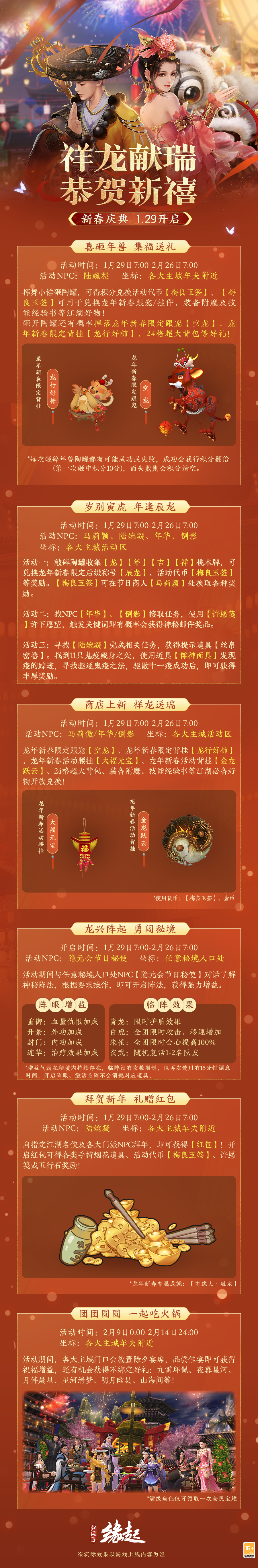 新年全新充消礼相赠!1月29日7:00至2月23日7:00,充消达240元可领取龙年主题功能跟宠“龙吉祥”,侠士召唤此跟宠并开启商店后,所有侠士可点击修理装备并换购烟花,每20小时可开启一次。侠士充消120元可领取精美背部挂件“缥雨垂香”,充消60元可领精美腰部挂件“轻羽吟风”。