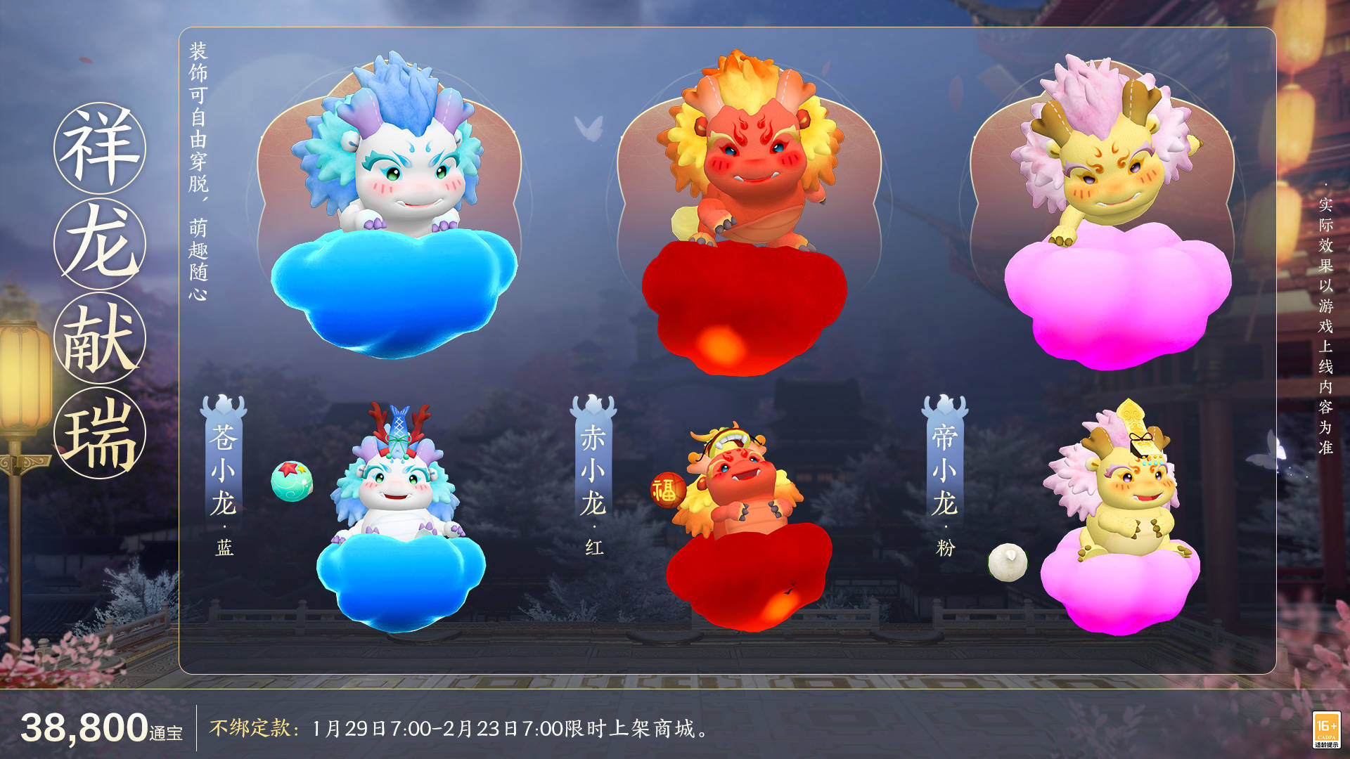 “苍小龙”粉颊玉面,龙鳞透亮晶莹,俯身与身旁鱼群玩耍嬉闹,满含童趣与欢乐;“赤小龙”通体霞红,身侧龙珠祥云带来福意满满;“帝小龙”惹人怜爱,如余霞成绮,优雅靓丽。小龙们偏爱呆在侠士的肩侧与头顶,与侠士一同开启新年新际遇!