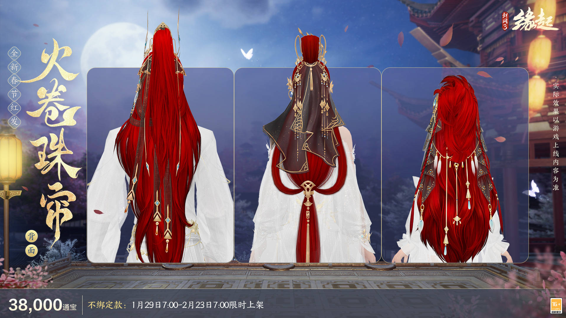 暗香摇疏影,点烛卷珠帘。全新红发“火卷珠帘”华美登场,成男款单侧鬓发垂于脸旁,霸气独特,金丝发冠高束后发,更显威严矜贵,珠玉缀羽落于肩侧,增添一分恣意潇洒;成女款金丝草叶配以嵌玉金步摇高梳发髻,加之以黑色轻纱垂于发后,额前宝石莹莹生光,温婉大气;萝莉款发上金饰蝴蝶翩飞,长发如瀑,加以青绿珠玉点缀其间,精致俏皮。