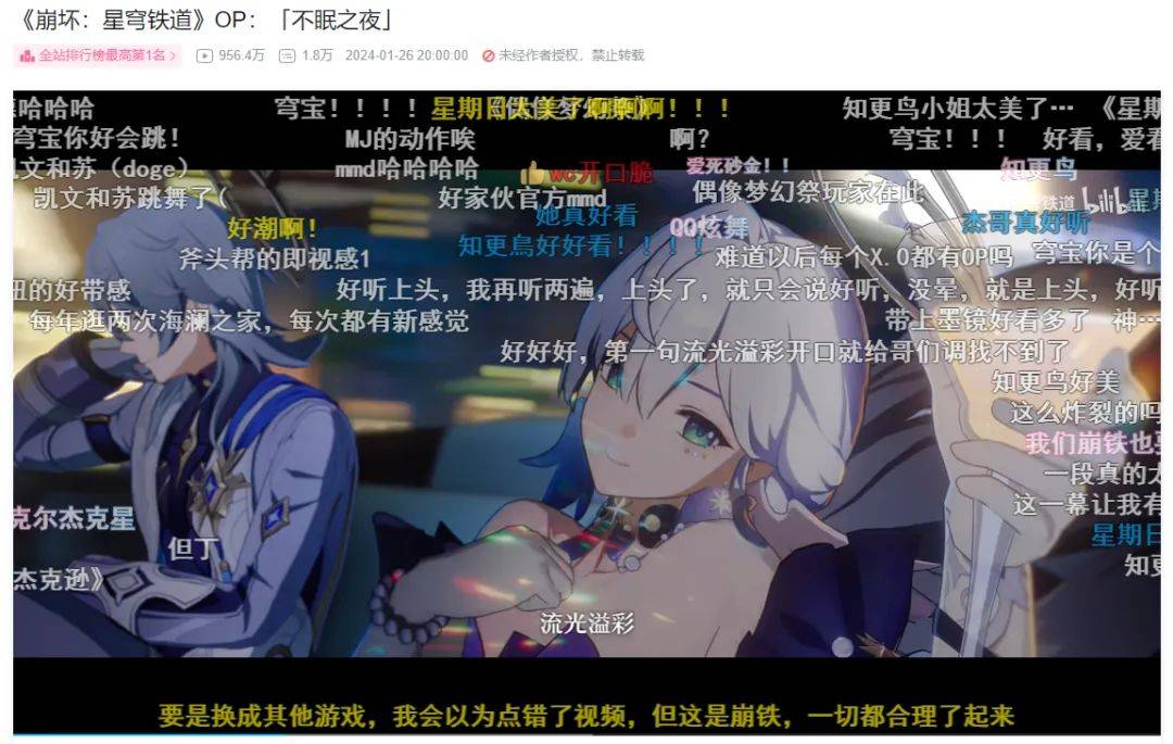 值得注意的是,该作在文化出海方面也有亮眼表现,特别是故事进入到中国味道满溢的仙舟罗浮后,更多结合传统文化的表达得以展现,而在1.3版本中,极具东方气质的丹恒·饮月,与水墨风格叙述龙裔兴衰的PV「仙舟通鉴•五龙远徙」更带动了海外用户对传统文化的兴趣。进入到2024年,《崩坏:星穹铁道》即将来到新版本“匹诺康尼”,在几天前的前瞻特别节目中,该作放出了携手张杰打造的OP「不眠之夜」,目前在B站上的播放近千万,可谓是在2024年又开了一个好头。