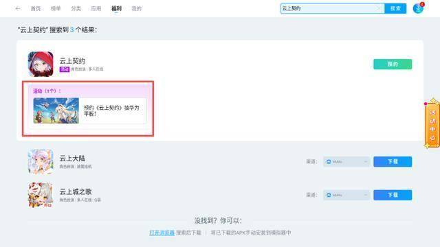 方法一:启动模拟器,在游戏中心搜索“云上契约”,点击预约,待游戏公测开启即可畅玩;