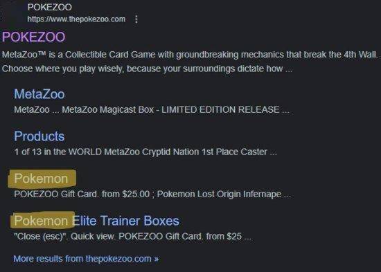 在Google搜索PokeZoo后,就能发现该品牌更多的侵权证据,下面的锚文本直接显示为Pokemon。PokeZoo被描述为“一款具有突破第四堵墙的突破性机制的集换式卡牌游戏”。网站商店里也售卖卡牌捆绑包,目前该网站已被关闭。