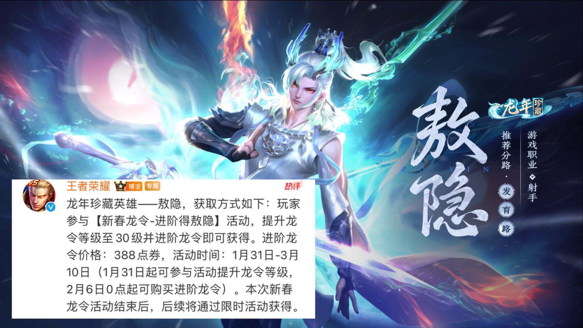 在二月份,王者荣耀将会上线S34赛季的第一位新英雄敖隐,这个英雄也是龙年贺岁英雄,英雄的设计原型就是小白龙。