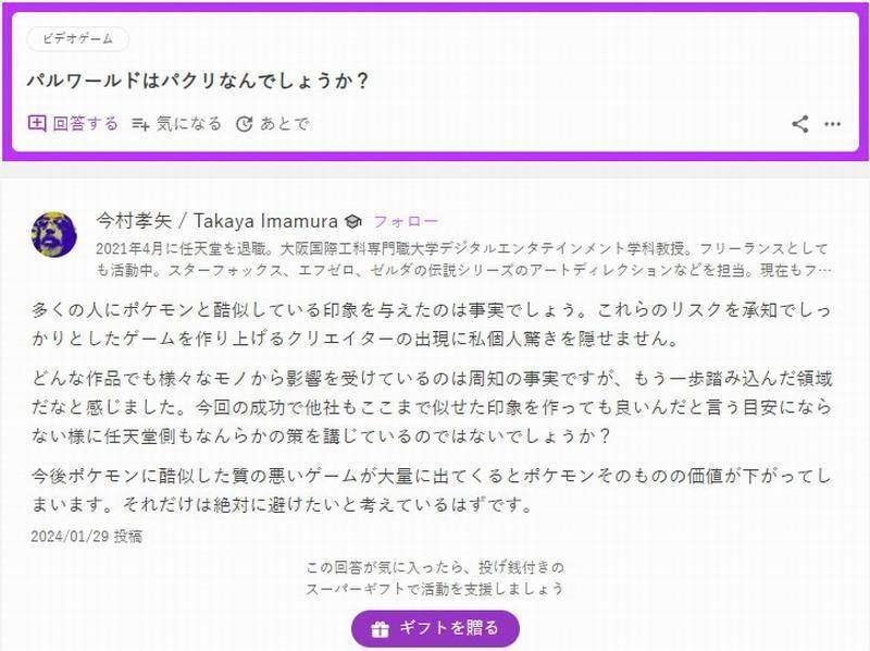 今村孝矢说:“《幻兽帕鲁》这款游戏给许多人留下了酷似《宝可梦》的印象。对于明知有如此风险,还能认真将游戏制作出的创作者,我个人感到非常惊讶。”
