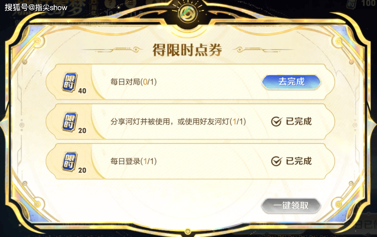 如果不在乎时间的话,按照分享河灯最低的标准40点券计算,每日打一场比赛,那么每日就是120点券,最晚17天完成,如果没有时间打游戏,每天拿到高级河灯也可以17天完成。