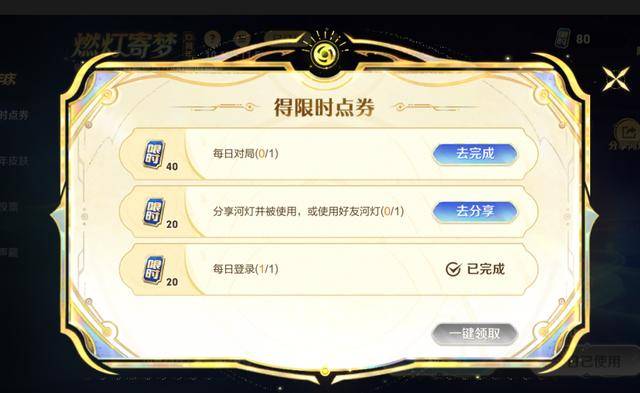 2、参与【燃灯寄梦】活动,完成三个福利任务(每日实战+被使用自己的河灯或者使用别人的河灯),每天最多可以获得80限时点券。
