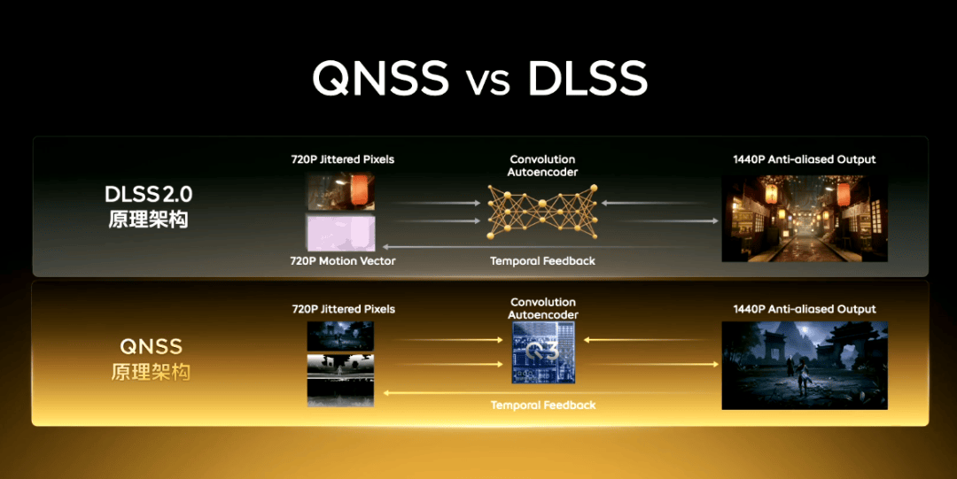 这么说无疑太绕了,换个更简单的例子来类比,就是这套技术和英伟达DLSS 2.0的原理高度一致,效果也很显著,例如从演示的结果来看,QNSS能将720P的输入画面实时超分为接近原生2K的图像。